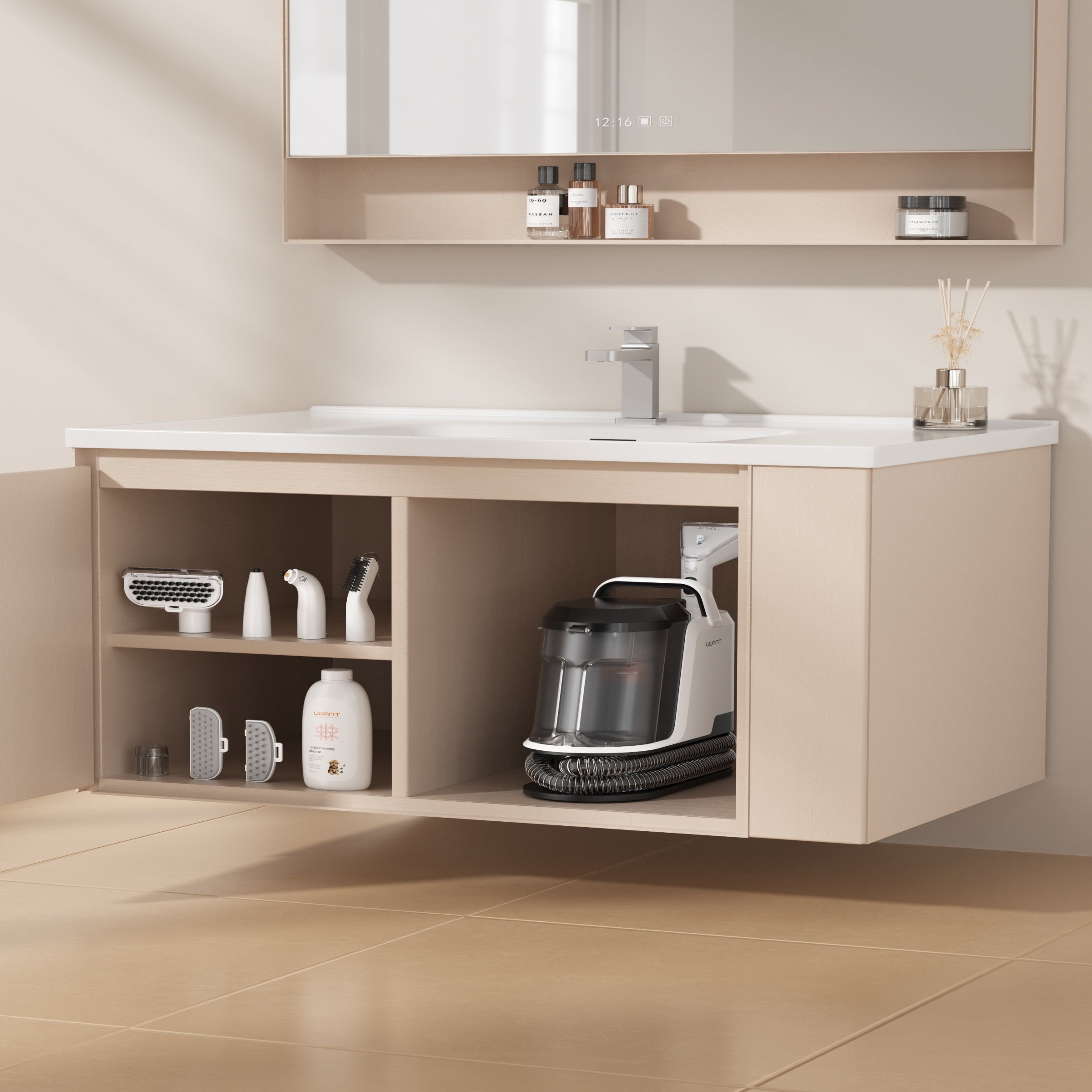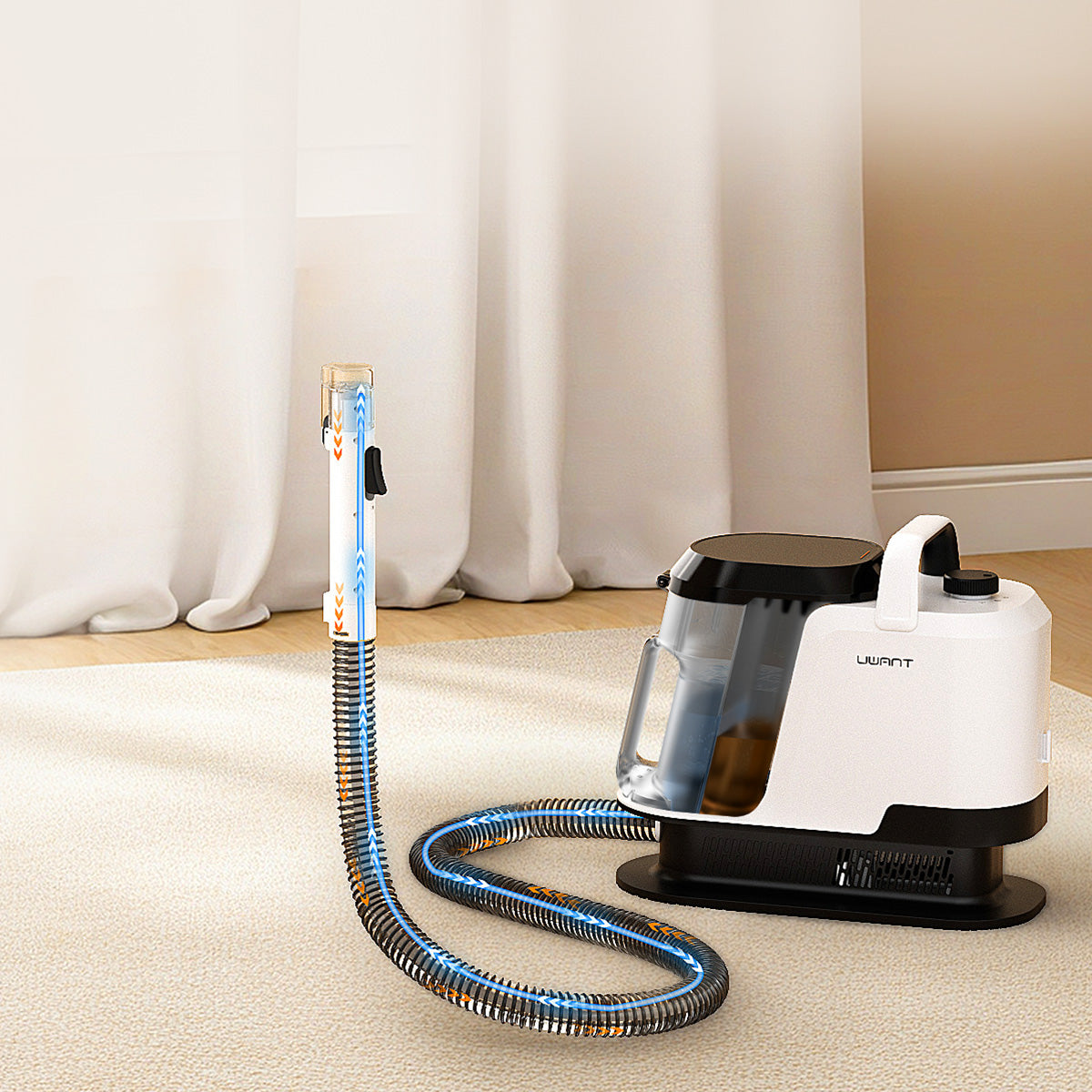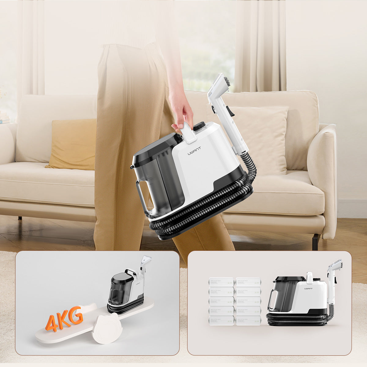 UWANT Y100 Steam כולל מיכל מים מפוצל (נקי/מלוכלך) בנפח גדול, עם ניקוי עצמי לצינור. המנוע שומר על רמת רעש נמוכה במיוחד, והעיצוב החכם חוסך מקום אחסון. אידיאלי לניקוי מהיר, שקט והיגייני של ספה, שטיח ומזרן.