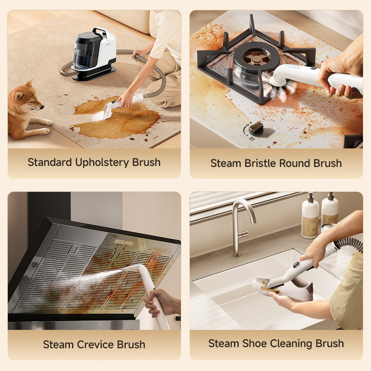 מברשת דו שימושית רגילה, מברשת דו שימושית גדולה, מברשת נעלים, אביזר קיטור לניקוי בקיטור, אביזר מברשת עגולה לניקוי בקיטור,